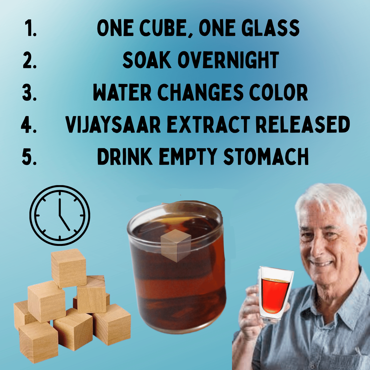 Boil 10 cubes in 2 cups water for 5 minutes. Cool and strain. This activates the Vijaysar and removes excess color.